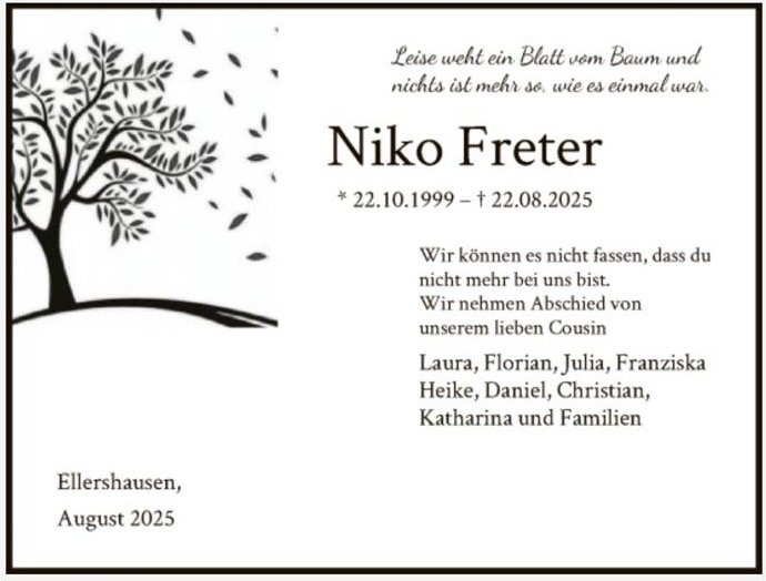 es ist schwer, die richtigen Worte zu finden – eigentlich gibt es sie nicht. Der plötzliche Verlust eures Sohnes ist unbegreiflich, und nichts kann diesen Schmerz wirklich lindern. Auch meine Worte können keinen Trost schenken, und doch möchte ich euch wissen lassen, wie sehr ich in Gedanken bei euch bin.